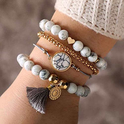 Simsly Set di braccialetti a strati Boho per donne con perline turchesi braccialetti con ciondolo a forma di cuore con nappa, accessori per gioielli per donne e ragazze (4 pezzi), Metallo
