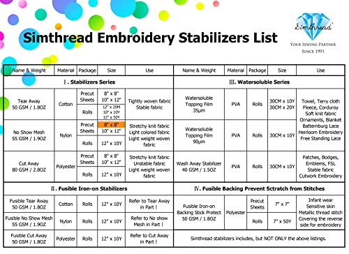 Simthread - Stabilizzatori per ricamo Cut-Off (Maglia invisibile) per ricamo, nylon 100%, peso: 55 g, 20,3 cm x 20,3 cm 100 pezzi - Fogli pretagliati per cerchi da ricamo a macchina 4x4 e 6x6