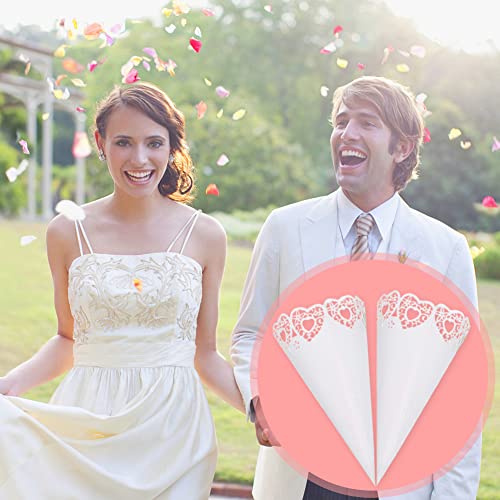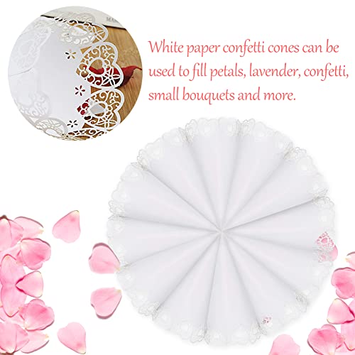 Carving Heart Design: coni bianchi sono scolpiti a forma di cuore e bordo arco, delicato ed elegante. Coni di coriandoli di carta bianca possono essere utilizzati per riempire petali, lavanda, coriandoli, piccoli mazzi e altro ancora. Ideale per l'arredamento di matrimoni, buffet e feste di compleanno.