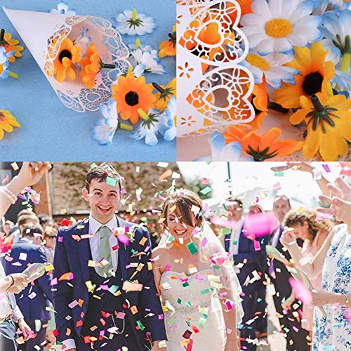 Dimensioni: La dimensione espansa dei coni di coriandoli nuziali è 14 cm x 14 cm / 5,51 pollici x 5,51 pollici e la dimensione del prodotto finito è 5,5 pollici x 1,57 cm (nella parte più ampia in alto), dimensioni perfette per un lancio di coriandoli al matrimonio, solo riempiendoli e mettendoli in piedi in un paio di grandi cesti.
