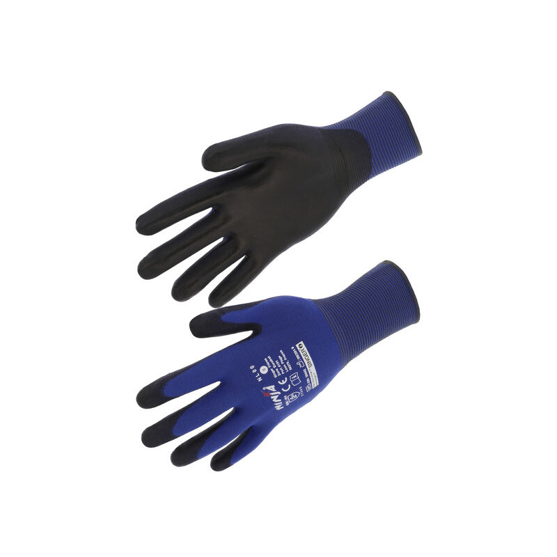 Gant de protection. Montage tricoté une pièce. (sans couture). Jauge 18. Support polyamide. Enduction polyuréthane (PU). Version paume enduite. Dos aéré (non enduit). Poignet élastique. Coloris: support bleu. Enduction noire. Collection Ninja®. AVANTAGES Super sensibilité, extra fin (JAUGE 18 !).Environ 30% plus léger que les gants polyamide/PU habituels. Confort extrême. Montage sans couture: améliore le confort de l'utilisateur (absence d'aspérité, de points d'échauffements). Améliore la dextérité pour la prise d'objets fins. Le dos aéré (non enduit) laisse respirer la main et améliore la souplesse du gant. Le poignet tricot élastique assure un bon maintien de l'équipement. La fabrication certifiée ISO 9001 vous garantit la fiabilité et la régularité de la production. NORMES EN 420 EN 420 EN 388 EN 388 3120X TYPES D'APPLICATION Entretien MaintenanceIndustrie LégèreSecond œuvre