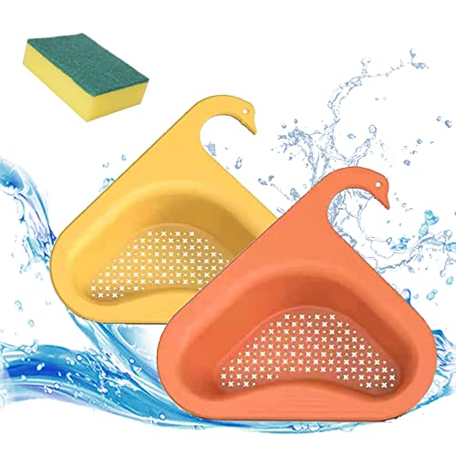 Sink Strainer Basket Triangular, Lavello da cucina Scolapiatti, Swan Drain Basket, Rack di scarico per lavello sospeso con spugne di lavaggio (Giallo e Arancione)
