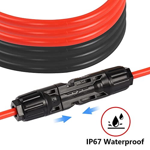 【Cavo di collegamento solare da 1 paio】 Due prolunghe solari da 10 AWG (6 mm2) realizzate con cavi solari in rame stagnato con connettori fotovoltaici IP67 in plastica PPO rigida, maschio e femmina su entrambe le estremità (1 rosso + 1 nero)