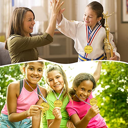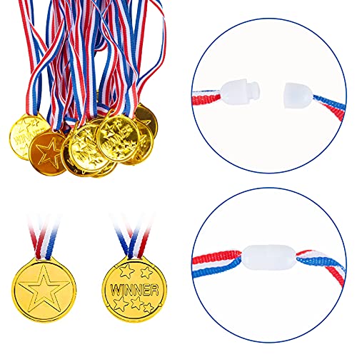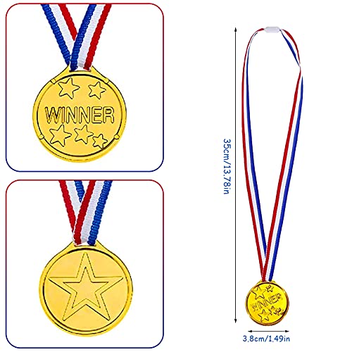 ▶ ▶ Design perfetto: su un lato di ogni medaglia d'oro c'è la parola "WINNER" con 5 piccole stelle, e il retro ha 1 grande stella, il colore del cinturino è rosso, bianco e blu. Al centro del nastro si trova un connettore bianco per trasportare facilmente medaglie di plastica. Ci auguriamo che ogni bambino diventi un vincitore e possa brillare come una stella.
