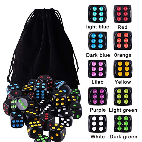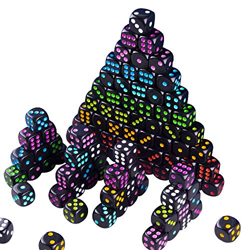 La confezione include: 100 pezzi di dadi neri a 6 facce, i pips in 10 colori diversi, 10 pezzi per ogni colore