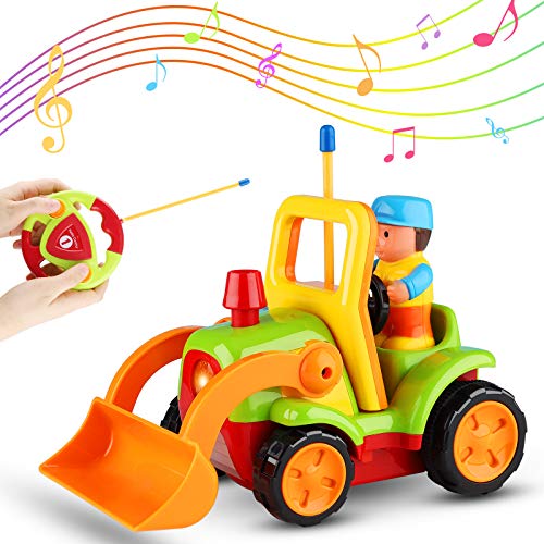 Funzionamento semplice e flessibile - Ci sono solo due pulsanti su questo telecomando, che è facile da usare per i bambini. Tramite il telecomando wireless, il trattore dei cartoni animati può essere ruotato in avanti e indietro o di 360 gradi. Il giocattolo del trattore necessita di 3 batterie AA e il controller wireless necessita di 2 batterie AA (non incluse)