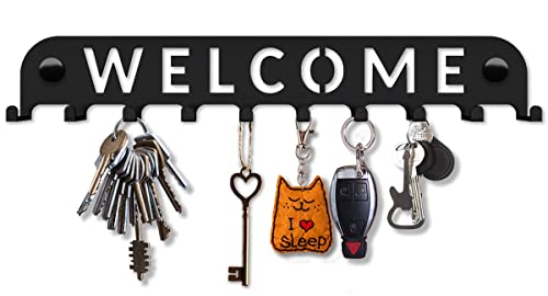 SirHoldeer Welcome Slim Portachiavi da parete con testo inciso 10 ganci per corridoio garage cucina Decorativo facile montaggio resistente in acciaio inox nero 270 x 45mm