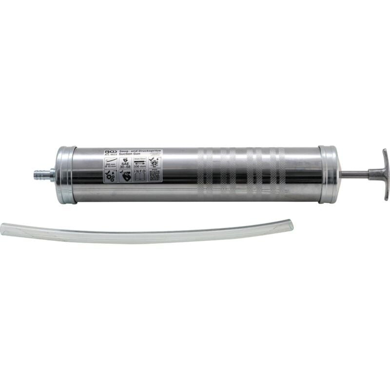 Adatto per olio e antigelo Adatto anche per oli per cambio, motore, assi posteriori e oli idraulici (viscosità da 30 a 68) Con tubo flessibile trasparente in PVC, lunghezza 280 mm, per aspirare / scaricare Lunghezza complessiva (senza tubo flessibile): 330 mm Ø interno del tubo flessibile 9 mm Ø esterno del tubo flessibile 12 mm Capacità: 500 ml Materiale: Lamiera di acciaio, zincata Finitura della superficie Verchromt Peso del tessuto 0.848 Diametro (C) 56,4 mm Dimensioni dell'imballaggio 1 Peso lordo 848 g