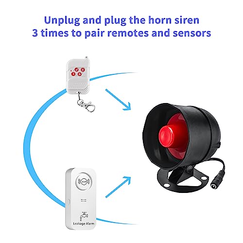 【Sistema di allarme di sicurezza】 Ecco un modo rapido e facile per installare un sistema di allarme per proteggere la vostra casa. Il set di 5 pezzi include: 1 sirena a corno, 2 rilevatori d'acqua, 1 telecomando e 1 adattatore di corrente. Un