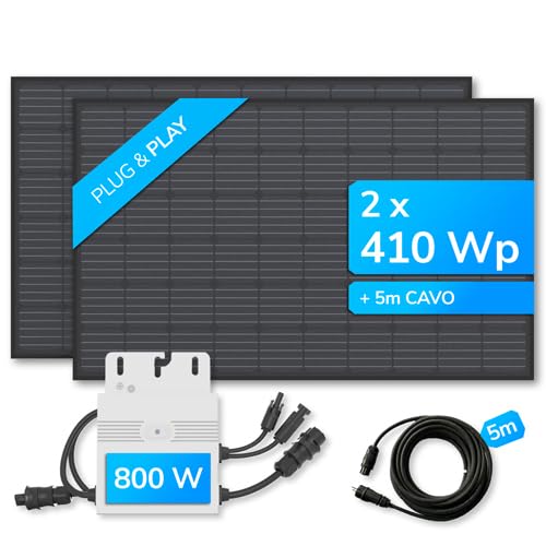 TUTTO CIÒ CHE SERVE: Il kit fotovoltaico contiene 2 pannelli fotovoltaici monocristallini di Maysun (ciascuno di 1722 x 1134 x 30 mm) da 410 Wp, un inverter Hoymiles (HM-800) con una potenza di 800W, un cavo di alimentazione di 5 m con presa Schuko e un manuale di istruzioni
