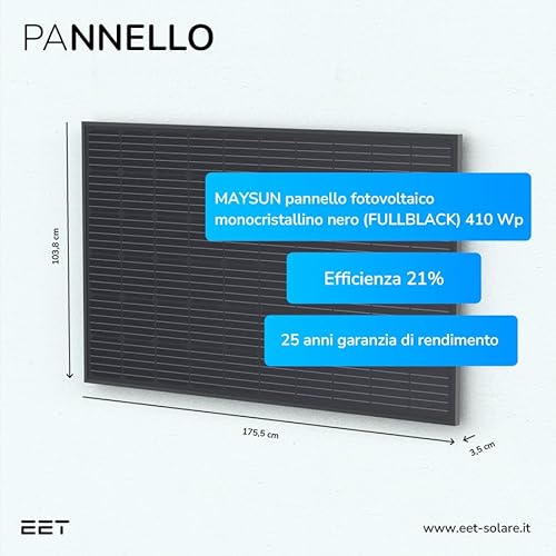 QUALITÀ, LONGEVITA' E UN DESIGN BELLISSIMO: Il pannello solare Full Black presenta una cornice in alluminio nero e un vetro di sicurezza: in questo modo all'estetica si somma l'efficienza con un rendimento del 21%. Questo modulo fotovoltaico resiste alla corrosione e alle intemperie e convince per la sua solidità e la durevolezza. La garanzia di rendimento è di 25 anni. L'inverter integrato, con un'efficienza massima del 96,7%, ha una garanzia di 15 anni
