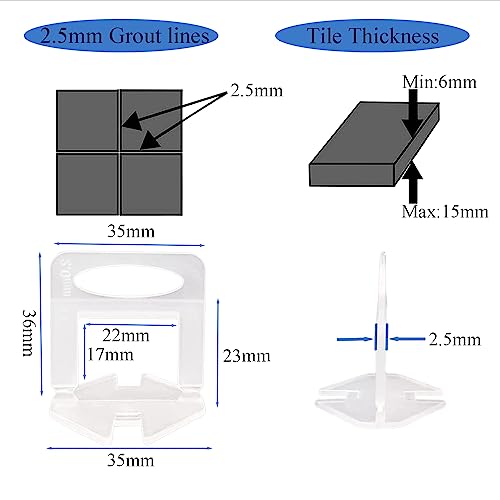 400 pezzi di fermi per piastrelle: 400 pezzi di distanziatori da 1,0mm/1,5mm/2mm/2,5mm/3mm. Utilizzando il nuovissimo materiale PP, alta resistenza, superficie liscia senza bave, non facile da schiacciare, è un buon strumento ausiliario per le piastrelle di pavimentazione. Utilizzabile su piastrelle di spessore da 6 mm a 15 mm. Non sono necessari altri strumenti di montaggio! Estremamente veloce e facile da installare e rimuovere. Può essere utilizzato per pavimentazioni e rivestimenti.