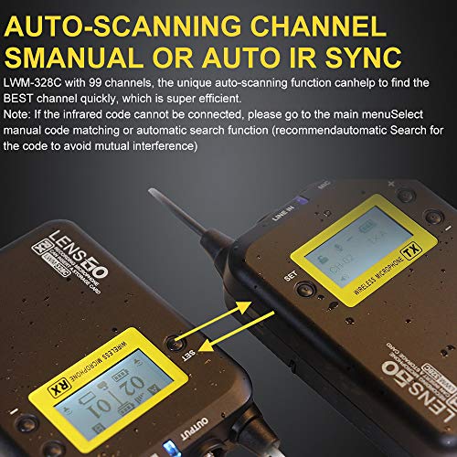 【99 CANALI SELEZIONABILI UHF】 1 trasmettitore da cintura attivato da 1 ricevitore, intensità del segnale RF regolabile o scansione automatica per la selezione rapida del canale al gruppo A / B. Con modalità di filtraggio low cut e sincronizzazione manuale / automatica. ricezione del volume e, allo stesso tempo, può eseguire una potente riduzione del rumore per evitare efficacemente la registrazione del rumore.
