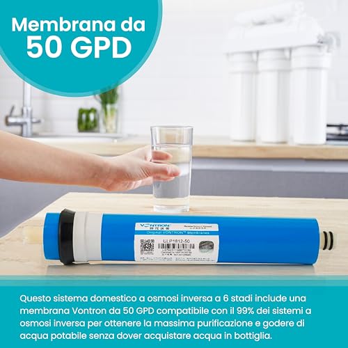 ATTREZZATURA PER OSMOSI INVERSA A 6 FASI: questa apparecchiatura per osmosi inversa domestica a 6 stadi è progettata per purificare l'acqua destinata al consumo. Viene fornito con 5 filtri, membrana Vontron da 50 GPD, serbatoio acqua in plastica da 3 galloni con una capacità di circa 5 litri utili (a seconda della pressione dell'acqua della rete in cui è installata l'apparecchiatura), rubinetto di servizio, attrezzi, manuale di montaggio, accessori e tutti i pezzi di ricambio necessari per l'installazione completa.
