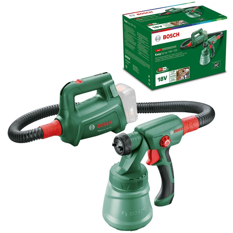 Bosch Sistema di verniciatura a spruzzo a batteria EasySpray 18V-100 Usa il sistema a spruzzo a batteria EasySpray 18V-100 per una verniciatura su legno e metallo semplice e veloce a batteria con risultati perfetti. Aree di impiego interne: porte, mobilio (sedie/tavoli/pensili/scaffali), pavimenti, soffitti altri, caloriferi. Aree di impiego esterne: steccati in legno e in metallo, pallet, telai di porte e finestre, esterni in legno, pavimenti di terrazze in legno, casette da giardino. Dati tecnici: Tensione della batteria: 18 V Autonomia con batteria da 2,5 Ah / 4,0 Ah: 11 min / 17 min Volume di erogazione: 0-100 ml/min Applicazione del colore: 1 m/min Capacita del serbatoio: 800 ml Lunghezza del tubo flessibile: 1,25 m Peso (senza batteria): 1,8 kg Dotazione: EasySpray 18V-100 Cinghia a spalla Spazzola per pulire Confezione in cartone.