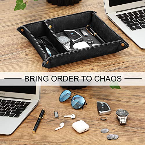 SITHON Vassoio Portaoggetti in PU Pelle con 2 scomparti removibili, Contenitore Svuotatasche Organizzatore da Comodino Scrivania per Gioielli, Telecomando, Chiavi, Telefono, (Nero)