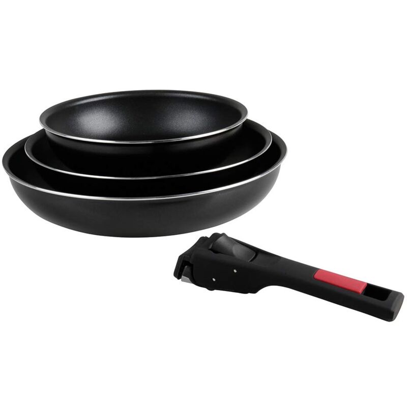 Set di 3 padelle Gamma Agile realizzate in alluminio pressato per una diffusione rapida e ottimale del calore. Rivestimento antiaderente Whitford Xilan senza PFOA. Adatte per tutti i piani cottura, inclusa induzione. La gamma Agile facilita la cottura, la pulizia e l'ordinazione grazie al manico rimovibile in plastica termo-resistente in Soft Touch