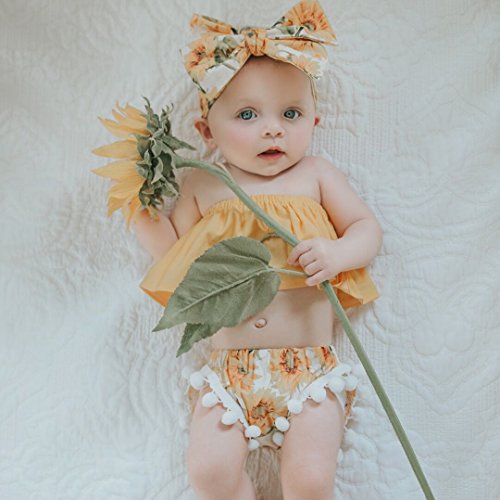 Siyova Costume da Bagno Bambina Costumi Tinta Unita Spalle Scoperte Crop Top+ Pantaloncini con Nappine con Stampa Girasole+ Fascia per Capelli 3 Pezzi Completo Bambina Estate (Giallo, 6-12mesi)