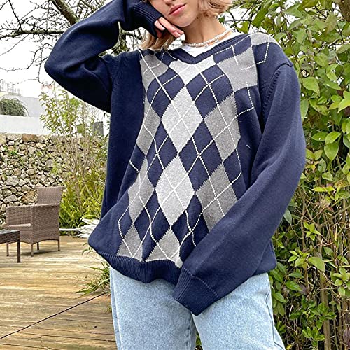 Siyova Maglione da Donna Sweatshirt Pullover Donna Y2K Argyle Stampato Manica Lunga Scollo a V Stile Preppy Sciolto Felpa Donna Sweatshirt Felpa Ragazza Vintage Streetwear (Blu Scuro, XL)
