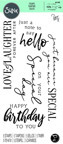 SUNNYSIDE #6 — Dite «Happy Birthday» e molto altro ancora con Sunnyside Sentiments #6 di Pete Hughes. Questa confezione include cinque timbri trasparenti che sono ideali per una varietà di progetti, dalla creazione di biglietti allo scrapbooking, alla creazione di carta e molto altro ancora! Crea un design personalizzato abbinando questo set con uno dei timbri a strati Sizzix, progettati per creare bellissime marche dimensionali. Assicurati che il tuo timbro sia perfetto con lo strumento per stencil e timbri Sizzix (664896).