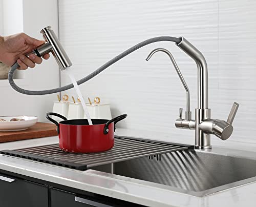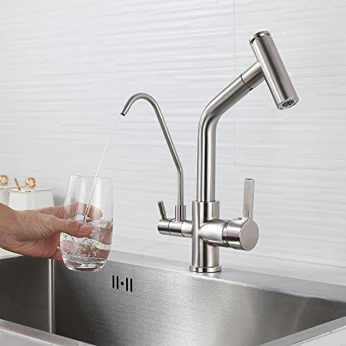 SJQKA Rubinetto 3 Vie Cucina Con Doccetta Estraibile, Ottone Per I Sistemi Osmosi Inversa Miscelatore 3 Vie Cucina Girevole A 360 ° Acqua Fredda E Calda (nichel spazzolato)