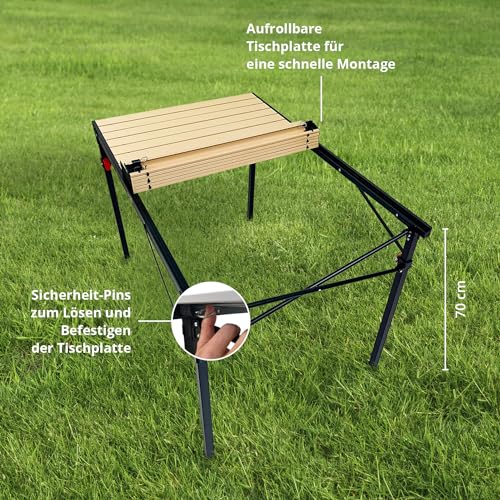✔ ARROTOLABILE E PIEGHEVOLE: il piano del tavolo può essere arrotolato e il telaio in acciaio è pieghevole grazie a uno speciale meccanismo di piegatura. Questo rende il tavolo da campeggio facile e veloce da montare e smontare. Il meccanismo di bloccaggio lo rende stabile e sicuro.