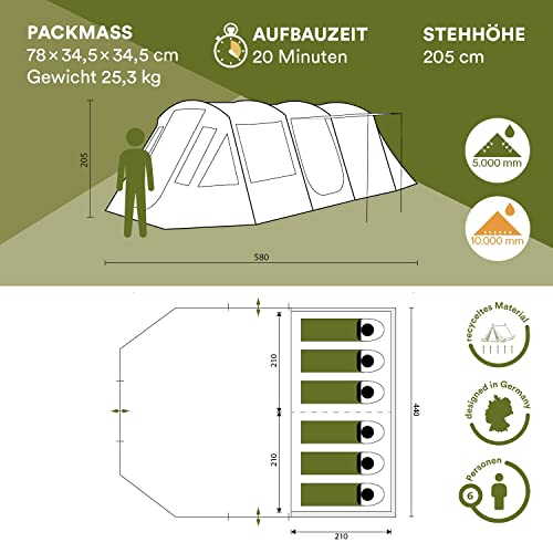 Skandika Nordland 6 Persone Tenda Campeggio Tunnel 580 x 440 cm zanzariera (Grigio/Verde)