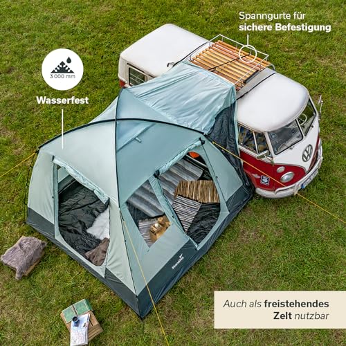 ✔ TANTO SPAZIO AGGIUNTIVO: la tenda veranda per camper estende la superficie abitabile del van di 9 m². 3 porte d'ingresso con zanzariere e 2 finestre con delle tapparelle distribuiscono molta aria fresca e luce naturale nella tenda.
