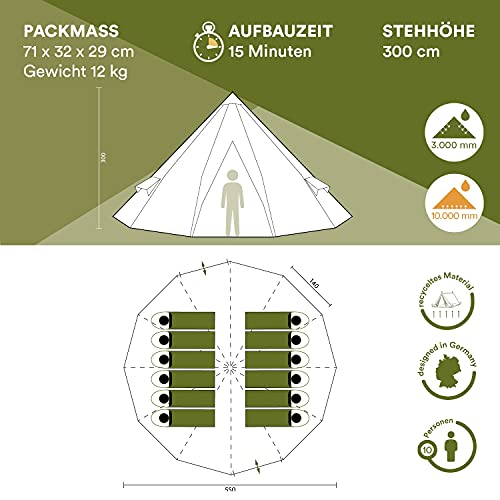 TENDA TIPI La spaziosa tenda piramidale offre spazio per un massimo di 10 persone. L'altezza ottimale di 3 m vi dà molto spazio per un'esperienza abitativa molto speciale in campeggio.