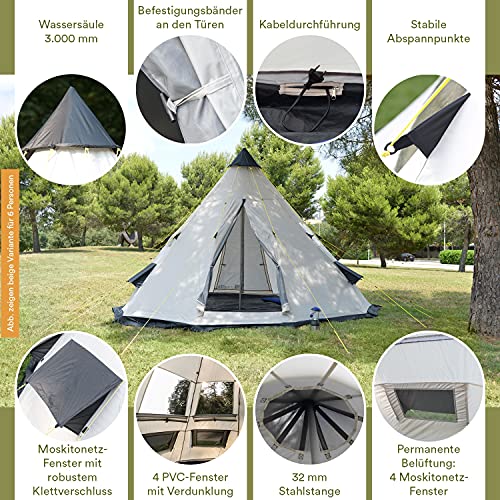 FORNITURA Le finestre per la luce extra e le prese d'aria oscurabili con zanzariera per il ricambio d'aria, completano le caratteristiche della tenda indiana. La tenda Tipii ha anche una colonna d'acqua di 3.000 mm sulla tenda esterna e di 10.000 mm sul pavimento della tenda, così come delle cuciture sigillate, che la rendono impermeabile.