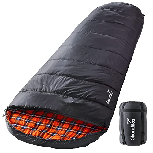 Skandika Vegas - Sacco a Pelo a Mummia XXL - Sacca di Compressione - Grande libertà di Movimento (Flanella Nero/Arancione Sinistra)