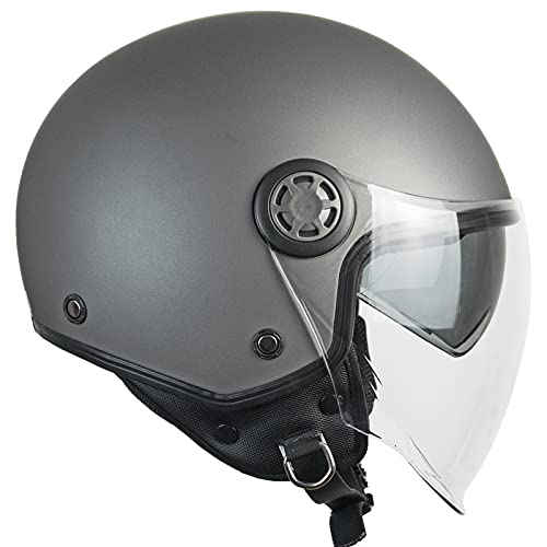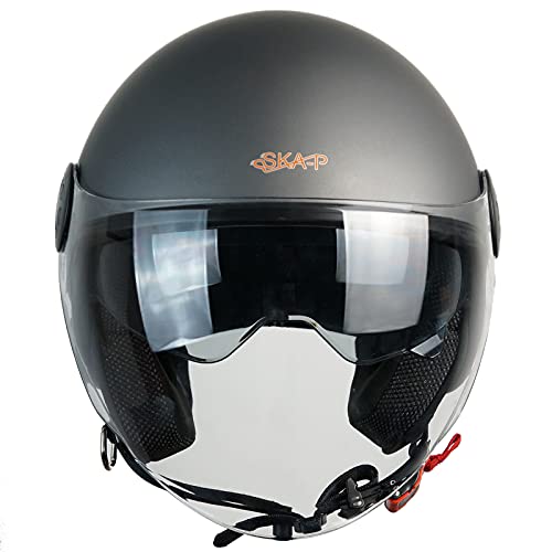 Demi-jet caratterizzato da lenti interne fumè al 75% e visiera esterna extra lunga, all'interno del box è previsto anche un visierino parasole da utilizzare in alternativa alla visiera.