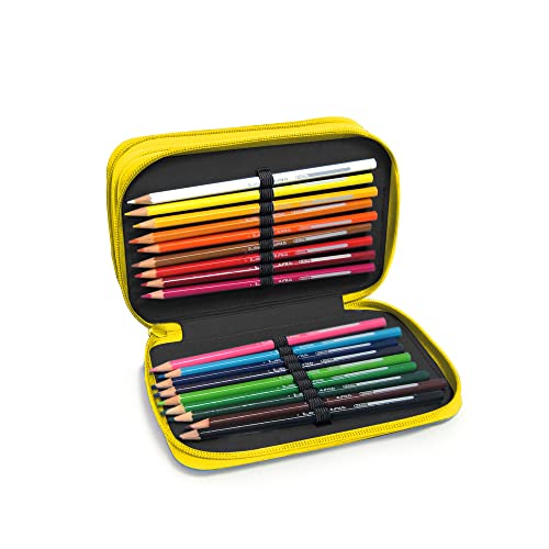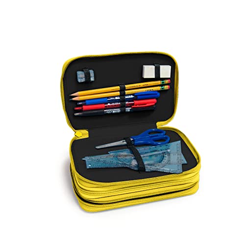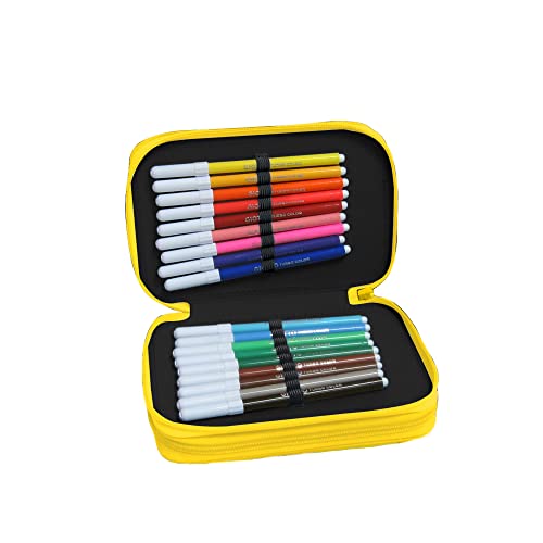 NE.ON! Sketch Astuccio 3 Scomparti Ragazzo Scuola Elementare, Media e Superiore, con 18 Pennarelli, 18 Matite Colorate, 3 Penne, altri Accessori Scuola, Tessuto Fibra Ecologia PET Giallo, Stile Urban