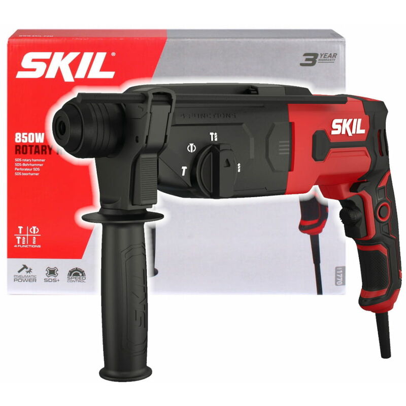 Impugnatura laterale orientabile per un migliore controllo ed una sicura presa a due mani Interruttore avanti/indietro per cambiare con facilità la direzione di rotazione dell'utensile Impugnatura morbida per un agevole utilizzo e un controllo ottimale dell'utensile Rotella di preselezione della velocità per impostare la giusta velocità per ogni lavoro Interruttore di velocità variabile con pulsante di blocco per lavorare in continuo La frizione di sicurezza protegge sia l'operatore che l'utensile in caso di bloccaggio della punta Potente tassellatore pneumatico da 850 W per una foratura senza sforzi nel calcestruzzo Impugnatura ergonomica per massima comodità durante l'uso Sistema «SDS+» per una rapidissima sostituzione delle punte Quattro funzioni: 1. foratura a percussione;