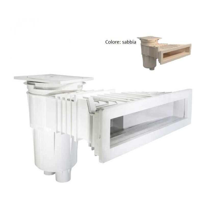 Skimmer sfioratore con inserti in ottone per membrana e liner sabbia Nuova gamma di skimmer LX7, serie MT-3 adatti per installazioni in piscine pubbliche e private, per pareti prefabbricate in CLS e pannellatura in acciaio. Fabbricati in ABS con trattamento UV. Completo di battente, regolatore di portata, regolatore in altezza del coperchio e cestello raccoglifoglie. Portata raccomandata 7,5 m3/h. Si consiglia l'installazione di uno skimmer ogni 25 m2 di superficie di acqua. Flusso nominale: 7 m3/h con collegamento da 50 e 10 m3/h con collegamento da 63 Attacco tubazione filettatura interna da 2" e 1 1/2". Colore: SABBIA