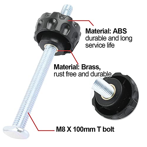 Dimensioni perfette: comode da tenere e facili da usare M8 Manopole di bloccaggio con manopola filettata interna. I bulloni a T presentano una superficie M8X100mm e uno spessore di 2,6 mm e si adattano all'interno della pista a T o della scanalatura in legno.
