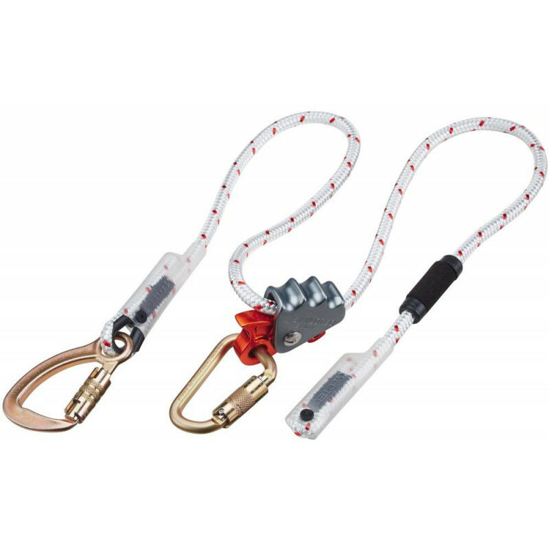 Corda di trattenuta Ergogrip SK 12. Moschettone KOBRA Design: - Non adatto agli spigoli - Resistente all'abrasione - Rimane morbido quando è bagnato - Può essere regolato molto facilmente con una sola mano - Diametro della corda: 12 mm - Moschettone su dispositivo: Steel D Tri - Moschettone su corda: Kobra TW - Durata di vita: 4-6 anni - Intervallo di temperatura da -35 °C a 45 °C Autorizzazione/standard: EN 353-2:2002. EN 358:1999 Materiale: - Corda: poliammide - Moschettone: acciaio. Alluminio