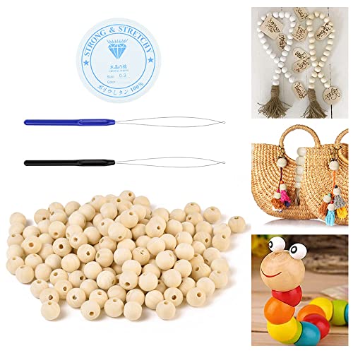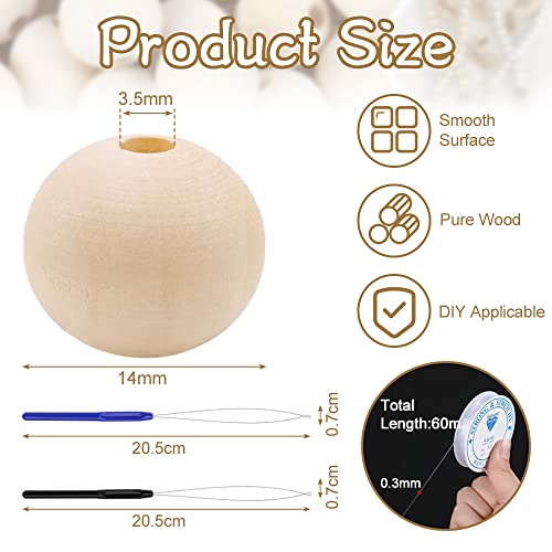 Skytowards 150 Pezzi Perline Legno Palline di Legno per Lavoretti Cerchi in Legno per Decorazioni Kit per Lavorazione Perline con 2 Infila Ago 1 Rotolo Filo Elastico per Artigianato Fai Da Te (14MM)