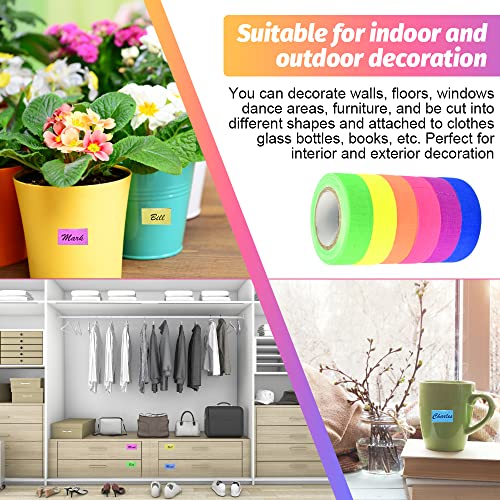 【12 rotoli nastro fluorescente neon tape, 6 colori diversi】 Il nostro nastro fluorescente neon tape ha 6 colori diversi (blu, verde, giallo, arancio, rosa e viola). Ogni colore ha due rotoli, un totale di 12 rotoli. La quantità è abbastanza sufficiente. È possibile utilizzare diversi colori per soddisfare le vostre esigenze diverse. Il nastro al neon può produrre chiaro effetto fluorescente sotto luce ultravioletta o nera.