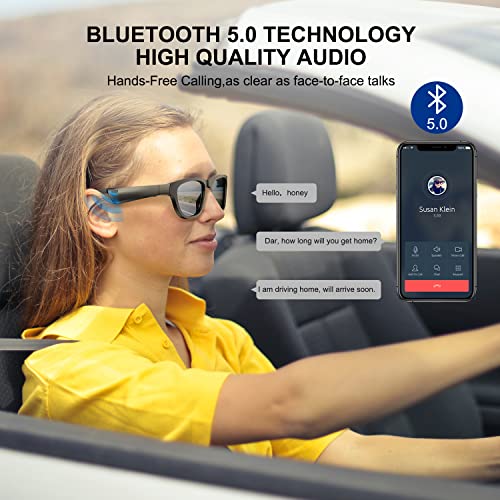 Open Ear Audio: Gli occhiali da sole Music Audio integrati nell'altoparlante trasmettono il suono alle orecchie per garantire un buon livello di volume senza distorsioni. Liberate le vostre orecchie: gli occhiali Bluetooth sono comodi e non causano dolore alle orecchie. Inoltre, con gli occhiali da sole audio Bluetooth è possibile ascoltare contemporaneamente i rumori esterni mentre si ascolta la musica, per continuare a comunicare con gli amici.