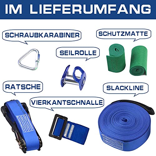 Il nostro set completo Slackline di alta qualità contiene 15 m di slackline con cricchetto, 2 tappetini protettivi, rotelle, moschettoni a vite e una fibbia quadrata. Per divertirsi si si consiglia i seguenti accessori: un volano adatto (ASIN B091DZ5NLR) e una corda da arrampicata (ASIN B091LB336W).