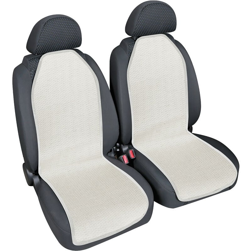 In carta tessile fresca di natura. Universali per auto, camper e veicoli commerciali equipaggiati con poggiatesta. Si installano in pochi minuti e si fissano utilizzando gli elastici in dotazione. Non compromettono gli Airbag dei sedili.