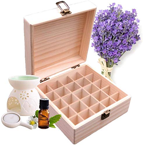 Adatto per bottiglie di olio essenziale da 5 ml, 10 ml, 15 ml, Dimensioni della Contenitore in legno 18,0 18,0 * 8,0 cm, 25 Dimensione dello slot interno 3,0 * 3,0 * 7,5 cm.