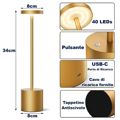 SLSMD Lampada da tavolo senza fili LED Ricaricabile Dimmerabile 6000mAh 3 Modalità di Luce Uso Interno/Esterno batteria Lunga Durata Trasportabile USB-C Lampada da tavolo (Oro)