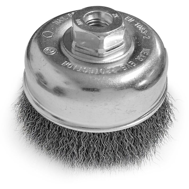 SM-TA FILO ONDULATO Spazzola a tazza Spazzola a tazza con filo ondulato. Per smerigliatrici angolari. Attacco M14 Lunga durata. Per leggere sbavature e pulizia dalla ruggine e sbavature delle testate dei tubi. Applicazioni Carrozzeria Rimozione Vernici, Rimozione Ruggini