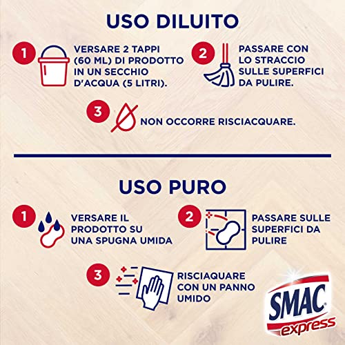 Prodotto: Smac Express Pavimenti Parquet e Cotto pulisce a fondo e protegge i pavimenti più delicati, non necessita di risciacquo e lascia un piacevole profumo di fresco e pulito che dura a lungo