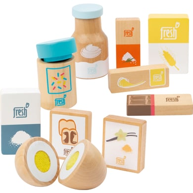 Dettagli del prodotto: Età: da 3 anni Set di ingredienti da forno da 10 pezzi in legno robusto Con illustrazioni facili da capire Aggiunta ideale per Kaufmannsl aden e cucina per bambini Dimensioni e peso: Dimensioni crema (altezza x diametro): circa 8,5 x 4,5 cm Dimensioni zucchero alla vaniglia (lunghezza x larghezza x altezza): circa 4 x 1 x 5 cm Materiale e cura: Materiale: legno Incluso nella consegna: Farina, zucchero, panna, sale, lievito, zucchero vanigliato, uovo diviso