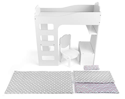 Grazioso letto a soppalco per bambole in legno massiccio con biancheria da letto abbinata in colori delicati
