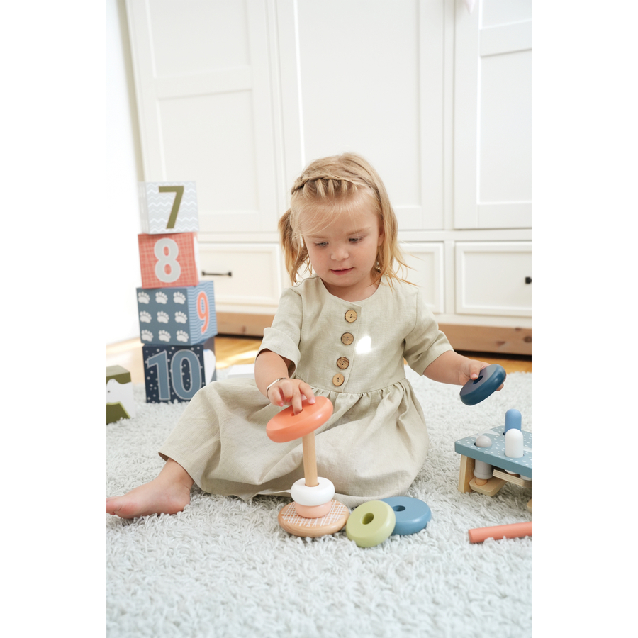 Dettagli del prodotto: Età: da 12 mesi Questa torre impilabile in legno certificato FSC® 100% motiva anche i bambini più piccoli a ordinare i sei anelli di diversi colori in base alle dimensioni e a impilarli l'uno sull'altro. In questo modo si allenano le capacità motorie, la coordinazione occhio-mano e la comprensione dei colori e delle dimensioni. Un ulteriore divertimento è dato dalla base arrotondata, che permette alla torre di impilare di dondolare avanti e indietro, sfidando così la destrezza dei bambini. Un perno mobile garantisce una maggiore sicurezza Questo classico dei motori a misura di bambino, realizzato in robusto legno e disegnato in modern en e allo stesso tempo in colori delicati, garantisce un divertimento di lunga durata. Il legno è morbido al tatto e piacevole da impugnare Dimensioni e materiale: Dimensioni una volta assemblato: Altezza: circa 15 cm, Ø circa 10 cm Materiale: legno, tessuto
