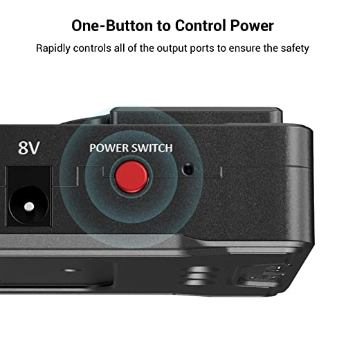 [DUAL D-TAP E USCITA DC] La piastra della batteria fornisce un attacco a V per una singola batteria con attacco a V ed è dotata di due uscite D-Tap da 14,8 V, un'uscita da 8 V DC, un'uscita da 12 V DC che può alimentare fino a 4 dispositivi, come fotocamera, monitor, trasmettitore, follow focus, telefono cellulare, ecc. L'adattatore della batteria è dotato di un pulsante di accensione sul lato che controlla tutte le porte di uscita in modo rapido e conveniente.